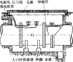 由于大口徑管道在多數場合下是埋在地下的,因此大口徑傳感器在安裝前應做好水泥地坑。圖6-19所示是在給排水系統中常見的安裝形式。水泥地坑應有足夠的活動空間,側壁埋有敷設電纜的鋼管,上有蓋板防止雨淋,下有泄水管以免坑內積水而使傳感器侵水。為了拆裝方便,傳感器應放在墊腳上,且在下游側裝有活絡的伸縮管。圖6-20是電磁流量計在地下水泥管污水排放系統中的安裝實例。