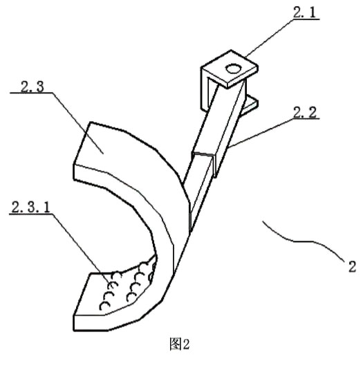 如圖2所示,所述定位裝置2包括U型連接組件2.1、可轉(zhuǎn)動(dòng)伸縮桿2.2、夾持弧形件2.3,所述U型連接組件2.1固定在所述測(cè)量導(dǎo)管1.2上,所述可轉(zhuǎn)動(dòng)伸縮桿2.2為長(zhǎng)方形伸縮桿,所述可轉(zhuǎn)動(dòng)伸縮桿2.2的右端部位通過(guò)銷(xiāo)軸與所述U型連接組件2.1鉸接,所述夾持弧形件2.3固定在所述可轉(zhuǎn)動(dòng)伸縮桿2.2的左端面,所述夾持弧形件2.3上設(shè)有滾珠2.3.1,若干個(gè)所述滾珠2.3.1位于所述夾持弧形件2.3的內(nèi)側(cè)表面上,所述滾珠2.3.1可相對(duì)所述夾持弧形件2.3滾動(dòng)。