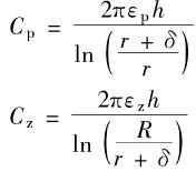 電容中心電極半徑為r,內(nèi)電極絕緣層厚度為 ∂,絕緣材料介電常數(shù)為 ep,傳感器外電極內(nèi)表面半徑為R,電極長(zhǎng)度為 六,se; 為注入水介電常數(shù),根據(jù)同軸柱狀電容器容量計(jì)算公式,可得絕緣層和被測(cè)介質(zhì)的電容 Cp、Cz, 為: