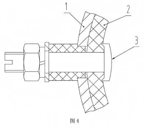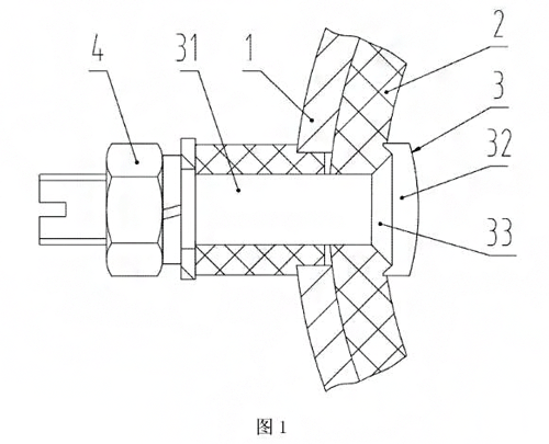電磁流量計是利用法拉第的電磁感應定律,即導電性液體在垂直于磁場的非磁性測量導電性液體在垂直于磁場的非磁性測量管內流動,與流動方向垂直的方向上會產(chǎn)生與流量成比例的感應電勢,我們根據(jù)感應電動勢的大小就可以知道流過的流量大小。電磁流量計電極的作用是從測量管中引出感應電動勢,而測量的介質可以是帶腐蝕性的各種液體,因此電極的密封和絕緣是非常重要的。參見圖4、圖5,現(xiàn)有的電磁流量計電極的安裝結構是這樣的:其包括金屬外管1、襯里2和電極3,襯里2設置在金屬外管1中,金屬外管的管壁設有用于電極3穿過的過孔,襯里2上設有與金屬外管上的過孔同心的裝配圓孔,電極3包括電極桿31和位于電極桿一端的電極圓頭32,電極桿31和電極圓頭32成型為體,電極桿31穿過襯里的裝配圓孔和金屬外管的過孔,電極圓頭32與襯里2內壁相接觸形成密封面。