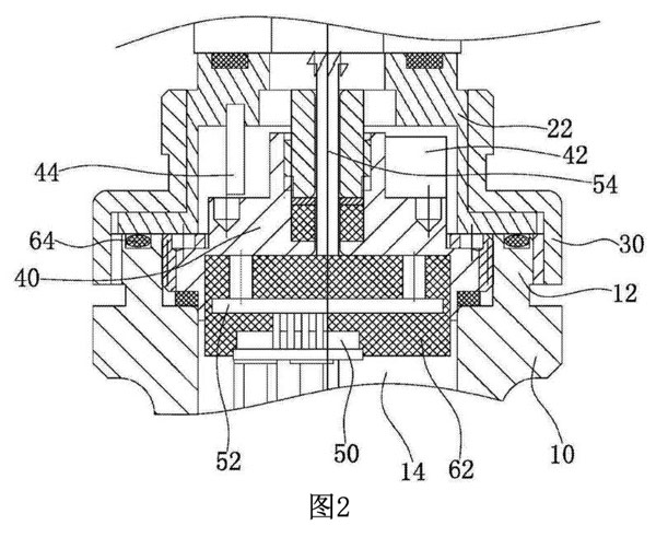 圖中各個標號統一說明如下:10、殼體:12、聯接頭:14、流體通道:20、表頭22、表頭聯接座:30、聯接蓋:40、傳感器座:42、防轉動片:44、防轉動軸:50、差壓傳感器52、電路板:54、通孔:62、密封膠:64、密封圈。