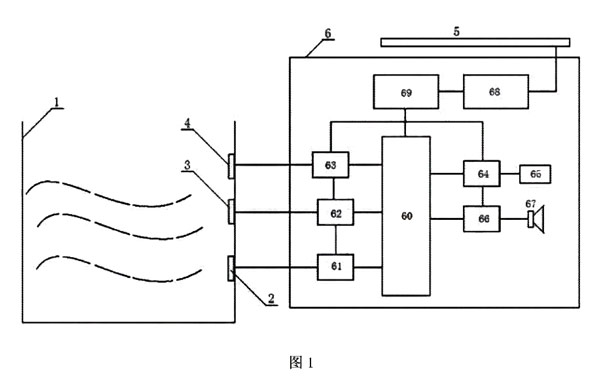 參照圖1,一種鉆井泥漿儲罐液位報(bào)警裝置,包括泥漿儲罐1、傳感器2-4、報(bào)警器6和太陽能電池5,所述泥漿儲罐1一側(cè)的內(nèi)壁上,自下而上順次設(shè)有第 一傳感器2、第 二傳感器3和第 三傳感器4,所述報(bào)警器6包括蓄電池68、穩(wěn)壓電路69、中央處理器60、第 一轉(zhuǎn)換電路61、第 二轉(zhuǎn)換電路62、第 三轉(zhuǎn)換電路63、隔離電路64、網(wǎng)絡(luò)接口65、放大電路66和喇叭67;所述第 一傳感器2通過第 一轉(zhuǎn)換電路61與中央處理器60的第 一輸入端相連接,第傳感器3通過第 二轉(zhuǎn)換電路62與中央處理器60的第 二輸入端相連接,第 三傳感器4通過第 三轉(zhuǎn)換電路63與中央處理器60的第 三輸入端相連接,中央處理器60的一輸出端通過隔離電路64與網(wǎng)絡(luò)接口65相連接,中央處理器60的另一輸出端通過放大電路66與喇叭67相連接,所述太陽能電池5與蓄電池68相連接,蓄電池68通過穩(wěn)壓電路69與中央處理器60、第 一轉(zhuǎn)換電路61、第 二轉(zhuǎn)換電路62、第 三轉(zhuǎn)換電路63、隔離電路64及放大電路65相連接。其中,所述第 一傳感器2、第 二傳感器3及第 三傳感器4均為壓電陶瓷片。所述中央處理器60為單片機(jī)電路或可編程控制器。